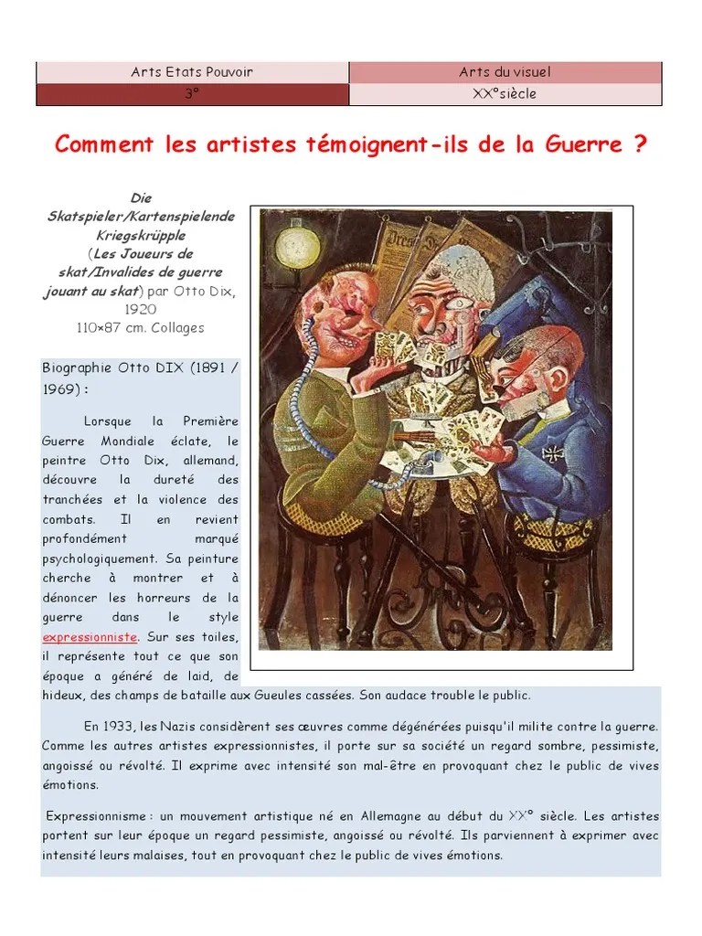 Nov 22, 2019 · otto dix et l'aprés guerre.. Il a vécu l'horreur des tranchées et la violence des combats. Issu d'un milieu ouvrier, otto dix. Fiche hda otto dix : Il réalisa plusieurs œuvres comme section de mitrailleurs à l'assaut (1916), les joueurs de skat ou invalides de guerre jouant aux cartes (1920), ou encore le marchand d'allumettes (1920) toutes consacrées à la 1ere guerre mondiale à laquelle il.